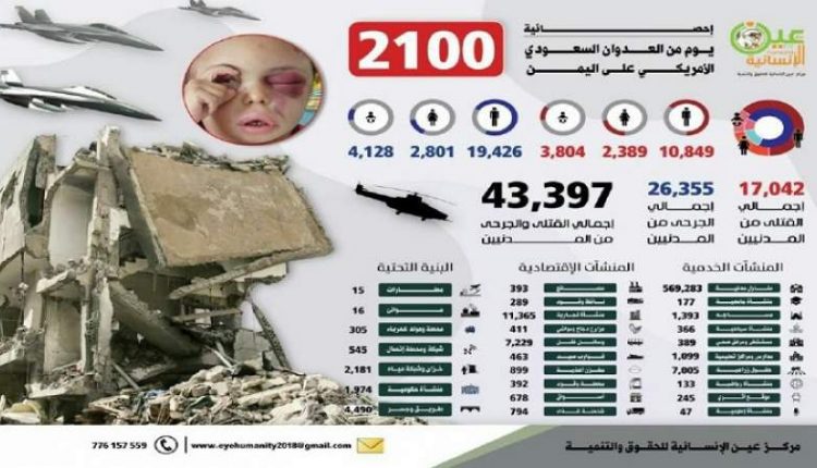 كشف مركز عين الإنسانية للحقوق والتنمية إحصائية جرائم العدوان خلال 2100 يوم من العدوان الأمريكي السعودي على اليمن.