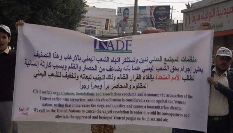 أدانت خمسون منظمة مجتمع مدني ومؤسّسة حقوقية وإغاثية ونقابة ومركز ومبادرة يمنية، قرار الإدارة الأمريكية تصنيف أنصار الله منظمة إرهابية.