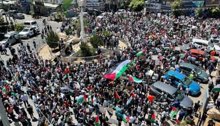 وفي ميدان المنارة وسط مدينة رام الله، تجمع آلاف الفلسطينيين للانطلاق بمسيرة حاشدة باتجاه حاجز بيت إيل شمال مدينتي رام الله والبيرة، ورفعوا أعلام فلسطين وهتفوا لفلسطين وضد عدوان الاحتلال، على وقع الأغاني الوطنية.