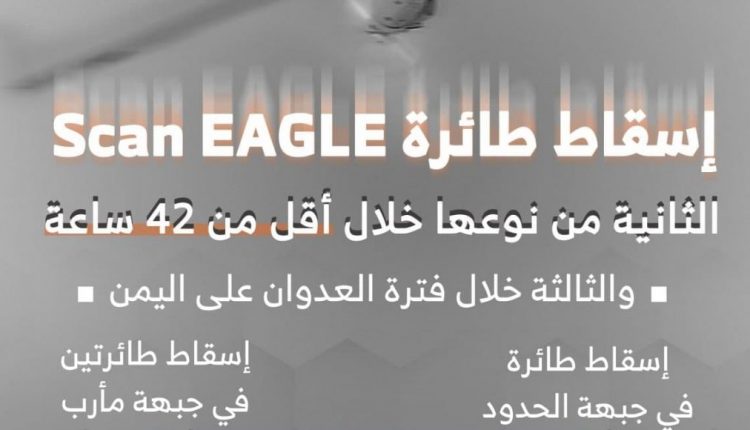 أعلن متحدث القوات المسلحة اليمنية العميد يحيى سريع، اليوم الثلاثاء، إسقاط طائرة تجسسية أمريكية نوع (سكان إيغل Scan Eagle). وأوضح العميد سريع أن الدفاعات الجوية تمكنت من إسقاط طائرة تجسسية أمريكية نوع (سكان إيغل Scan Eagle)، مشيرا الى ان عملية الاسقاط تمت بصاروخ أرض جو في أجواء منطقة المشجح بمديرية صرواح بمحافظة مأرب. ولفت الى ان الدفاعات اليمنية استهدفت الطائرة أثناء تنفيذها لعمليات عدائية في مأرب. وتعد (سكان إيغل Scan Eagle) ثاني طائرة من هذا النوع يتم اسقاطها في اقل من 48 ساعة والثالثة خلال امد العدوان على اليمن، حيث سبق للدفاعات الجوية وأن اسقطت في نوفمبر من العام 2019م هذا النوع من الطيران الامريكي الحديث في المناطق الحدودية.