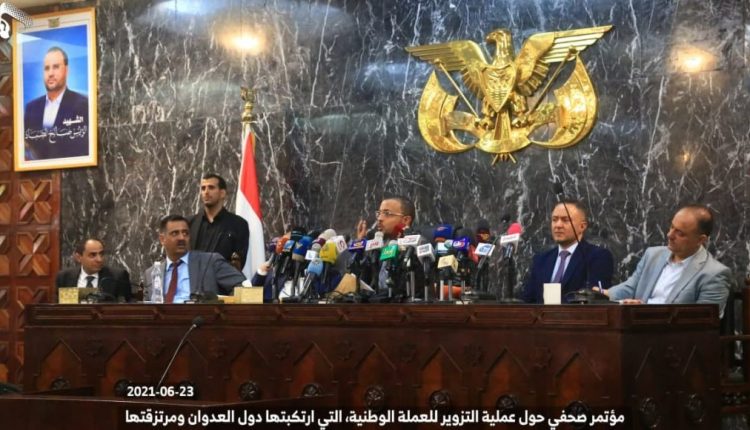 وقال” ومؤخرا وفي مؤامرة جديدة قام البنك المركزي في عدن بتوقيع عقد جديد بمبلغ ترليون ريال في العام 2020م من ضمنه مبلغ 400 مليار ريال من الفئة المزورة التي وصلت إلى مينائي عدن والمكلا والتي أصدر البنك المركزي في صنعاء أمس قرارا بمنع تداولها وحظر التعامل بها.