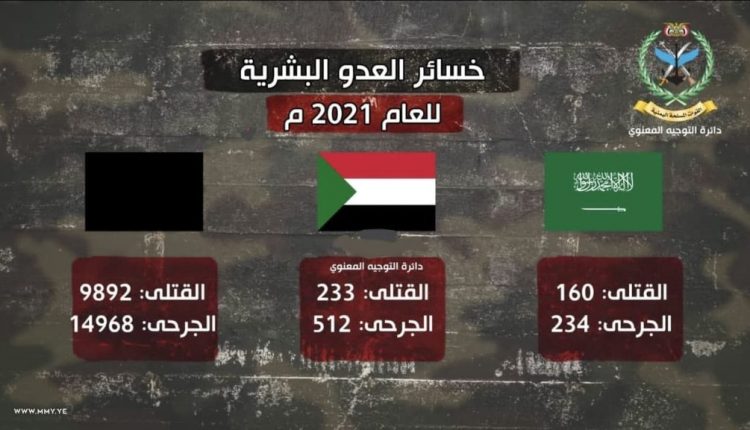وأوضح العميد سريع أن الجهات المختصة في القوات المسلحة تمكنت من توثيق خسائر العدو البشرية خلال العام 2021م حيث قتل وجرح 394 جندياً وضابطاً سعودياً .. منهم 160 قتيلا و234 مصابا.. كما قتل وجرح و 745 من المرتزقة السودانيين منهم 233 قتيلا وما تبقى مصابين.