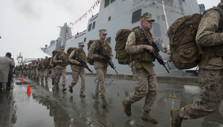 ANCHORAGE, Alaska (May 4, 2013) Marines assigned to Task Force Denali run to bring the ship to life during the commissioning of the San Antonio-class amphibious transport dock ship USS Anchorage (LPD 23) at the Port of Anchorage. More than 4,000 people gathered to witness the ship's commissioning in its namesake city of Anchorage, Alaska. Anchorage, the seventh San Antonio-class LPD, is the second ship to be named for the city and the first U.S. Navy ship to be commissioned in Alaska. (U.S. Navy photo by Mass Communication Specialist 1st Class James R. Evans/Released)