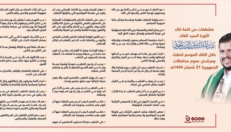 السيد القائد: يؤكد أن مسؤولية الخطباء عظيمة ومقدسة وتمثل حاجة ضرورية للمجتمع