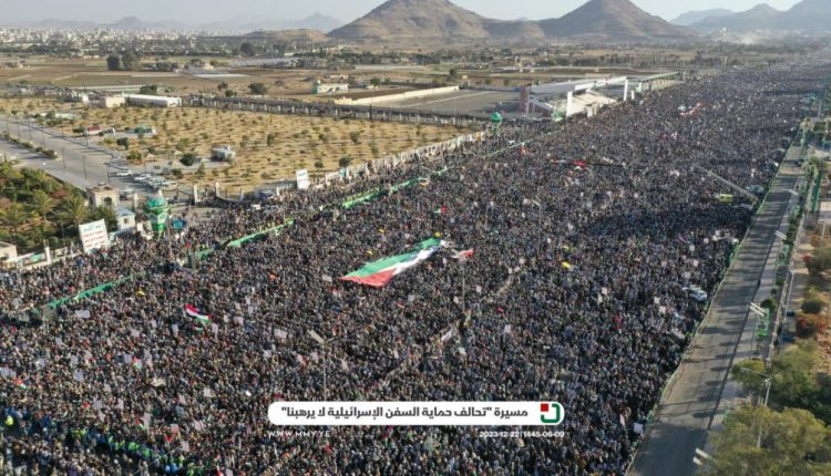 شهد ميدان السبعين في العاصمة صنعاء عصر اليوم الجمعة ، حشدا مليونياً في مسيرة ” تحالف حماية السفن الإسرائيلية لا يرهبنا “.