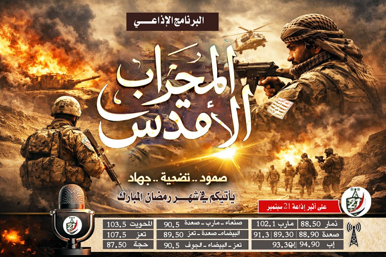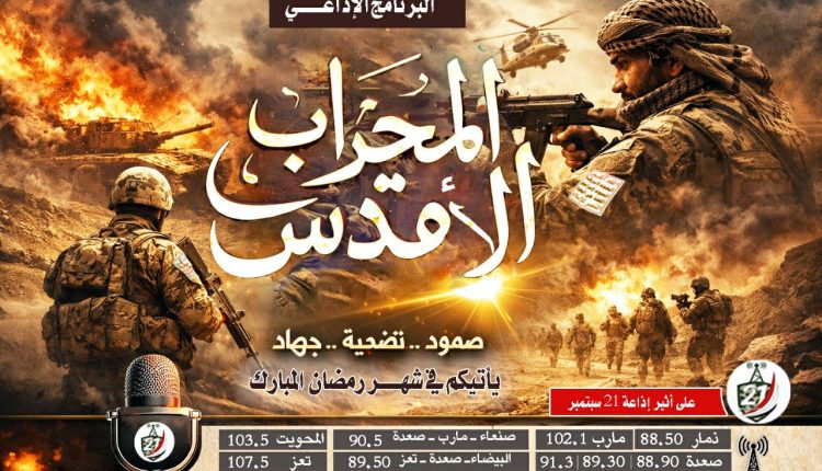 المحراب الاقدس قريباً على اثير إذاعة الحادي والعشرين من سبتمبر ، المحراب الاقدس مسابقة رمضانية خاصة بالمجاهدين في الجبهات تتطرق إلى أبرز النقاط في خطابات السيد القائد يحفظه الله، والى اهم المعارك التي خاضها المجاهدون واهم الشهداء الذين ارتقوا في هذه الجبهات