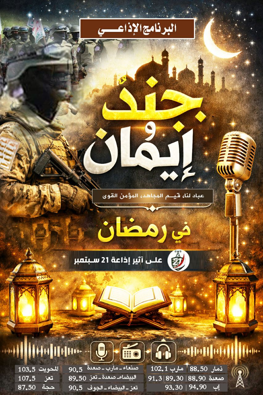 جند وايمان قريباً على اثير إذاعة الحادي والعشرين من سبتمبر كيف يجند الإنسان نفسه لله في مختلف المجالات العسكرية وكيف يجب ان نكون مجاهدين في كل اعمالنا وتصرفاتنا