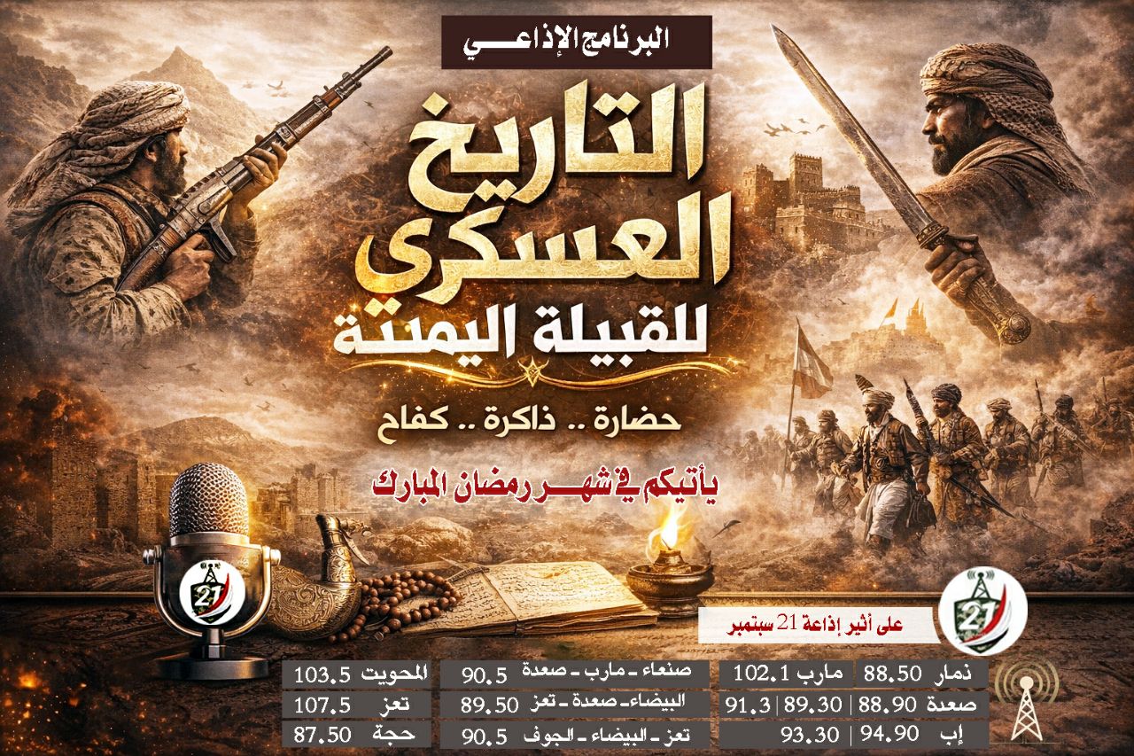 القبيلة اليمنية قريباً على اثير إذاعة الحادي والعشرين من سبتمبر القبيلة اليمنية برنامج يتطرق للحديث عن الدور التاريخي للقبيلة اليمنية في صد الغزاة وعن إيمان القبيلة اليمنية ووعيهم الديني ويربط بين العادات والتقاليد وانسجامها مع القران الكريم 21Sept.net X.com/FM21SEP FB.com/21sepnews ⓣ.me/FM21Sep1 ⓣ.me/FM21SEPL مشاركة FacebookTwitterGoogle+LinkedinTumblrTelegramWhatsAppEmailPrint