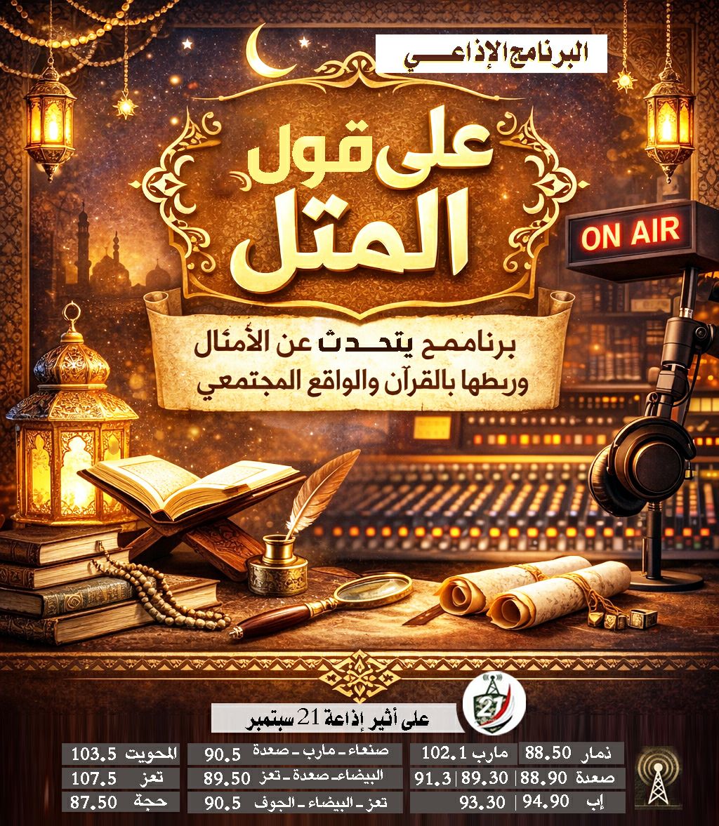 برنامج إذاعي يحكي عن معاني الامثال والحكمة منها كالمثل العسكري أو المثل المرتبط بأية قرآنية او المثل الشعبي . ويقدم تفسير للمثل والظروف التي أحاطت بالمثل وواقع المثل في حياتنا اليوم ويستهدف المجتمع.