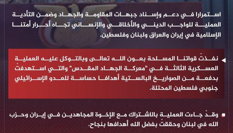 بيان القوات المسلحة اليمنية بشأن تنفيذ عملية عسكرية مشتركة مع الإخوة المجاهدين في إيران وحزب الله في لبنان استهدفت أهدافا حساسة للعدو الإسرائيلي جنوبي فلسطين المحتلة وذلك بدفعة من الصواريخ الباليستية.