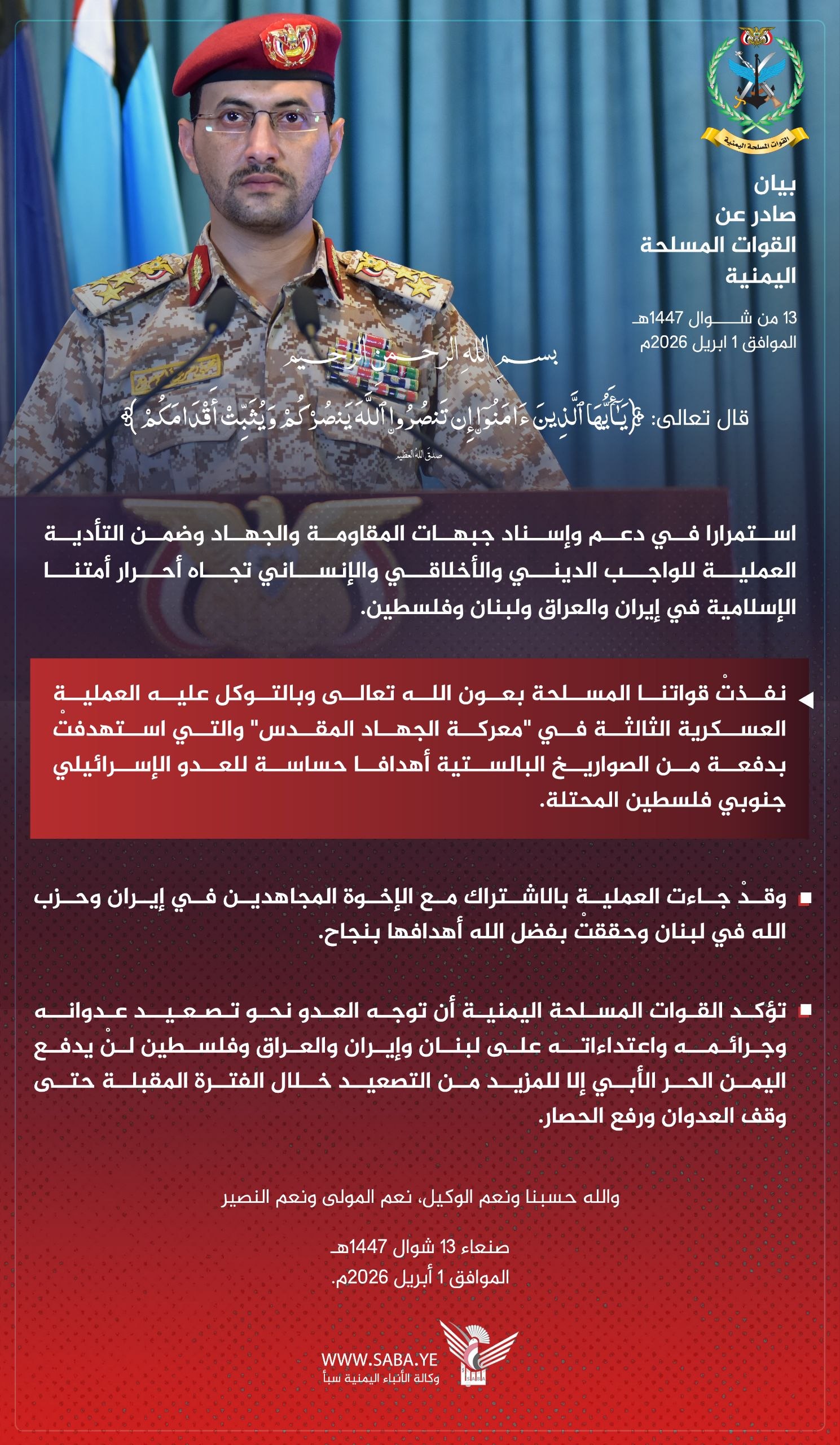 ​نَفَّذَتْ قواتُنَا المسلحةُ بعونِ اللهِ تعالى وبالتوكلِ عليهِ العمليةَ العسكريةَ الثالثةَ في “معركةِ الجهادِ المقدسِ” والتي استهدفتْ بدفعةٍ منَ الصواريخِ البالستيةِ أهدافاً حساسةً للعدوِّ الإسرائيليِّ جنوبيَّ فلسطينَ المحتلةِ.
