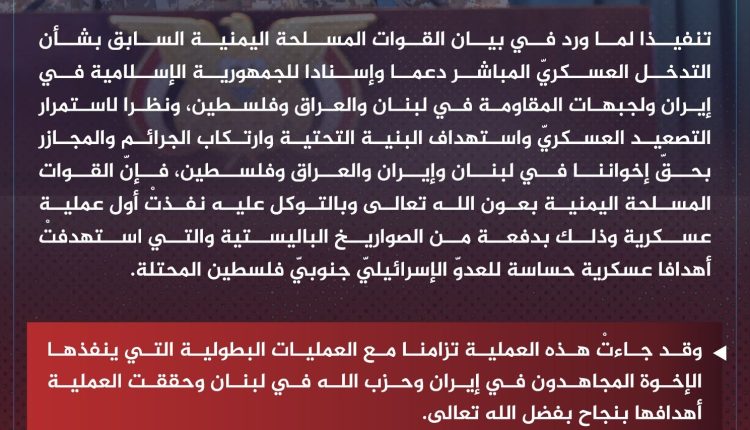 تنفيذاً لما وردَ في بيانِ القواتِ المسلحةِ اليمنيةِ السابقِ بشأنِ التدخلِ العسكريِّ المباشرِ دعماً وإسناداً للجمهوريةِ الإسلاميةِ في إيرانَ ولجبهاتِ المقاومةِ في لبنانَ والعراقِ وفلسطينَ، ونظراً لاستمرارِ التصعيدِ العسكريِّ واستهدافِ البنيةِ التحتيةِ وارتكابِ الجرائمِ والمجازرِ بحقِّ إخوانِنا في لبنانَ وإيرانَ والعراقِ وفلسطينَ، فإنَّ القواتِ المسلحةَ اليمنيةَ بعونِ اللهِ تعالى وبالتوكلِ عليهِ نفذتْ أولَ عمليةٍ عسكريةٍ وذلكَ بدفعةٍ منَ الصواريخِ الباليستيةِ والتي استهدفتْ أهدافاً عسكريةً حساسةً للعدوِّ الإسرائيليِّ جنوبيَّ فلسطينَ المحتلةِ.