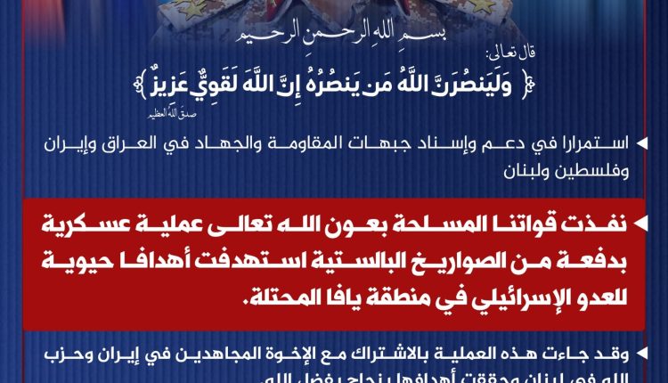استمراراً في دعمِ وإسنادِ جبهاتِ المقاومةِ والجهادِ في العراقِ وإيرانَ وفلسطينَ ولبنانَ نفذتْ قواتُنا المسلحةُ بعونِ اللهِ تعالى عمليةً عسكريةً بدفعةٍ من الصواريخِ البالستيةِ استهدفتْ أهدافاً حيويةً للعدوِّ الإسرائيليِّ في منطقةِ يافا المحتلةِ.