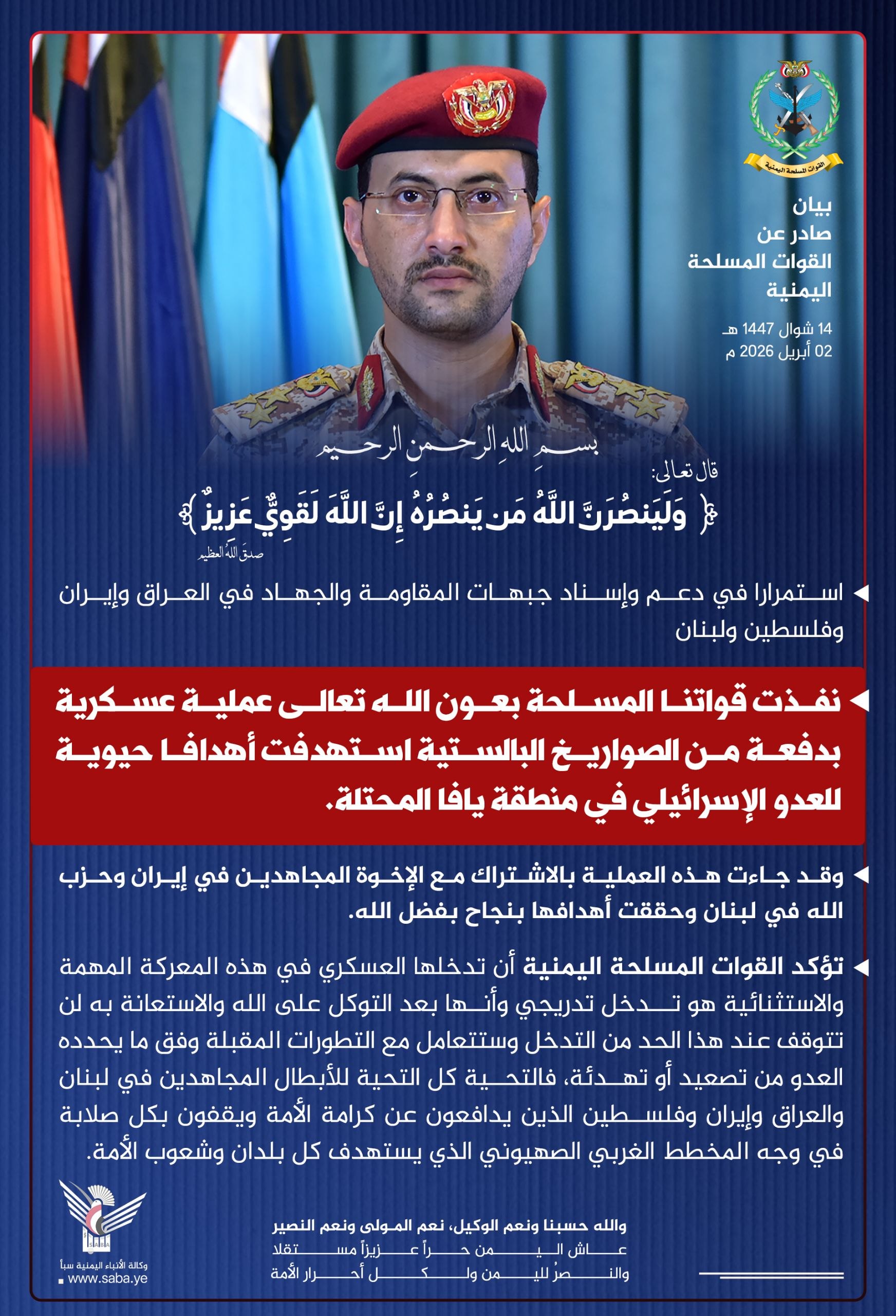 بيان القوات المسلحة اليمنية بشأن استهداف أهداف حيوية للعدو الإسرائيلي في منطقة يافا المحتلة بدفعة من الصواريخ الباليستية بعملية مشتركة مع المجاهدين في إيران ولبنان – 2 أبريل 2026م