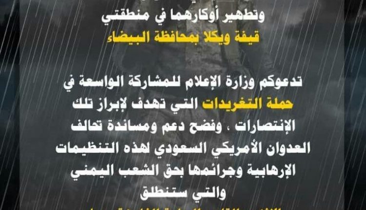 دعت وزارة الإعلام للمشاركة الواسعة في حملة التغريدات التي تهدف لإبراز انتصارات الجيش واللجان الشعبية على تنظيمي ما يسمى” داعش والقاعدة” وتطهير أوكارهما في منطقتي يكلا وقيفة في البيضاء، وفضح دعم ومساندة تحالف العدوان الأمريكي السعودي لهذه التنظيمات التكفيرية وجرائمها بحق الشعب اليمني.