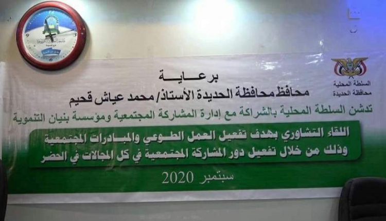 عقد اليوم السبت، بمحافظة الحديدة لقاءٌ تشاوري حول تفعيل العمل الطوعي والمبادرات المجتمعية نظمته السلطة المحلية بمديرية الحوك بالتعاون مع إدارة المشاركة المجتمعية بالمحافظة ومؤسسة بنيان التنموية.