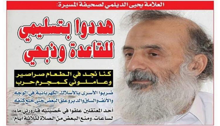قال العلامة يحيى الديلمي إنه تعرض خلال فترة اعتقاله من قبل المرتزقة في مارب للتعذيب النفسي وهدّدوا بتسليمه للقاعدة وداعش.