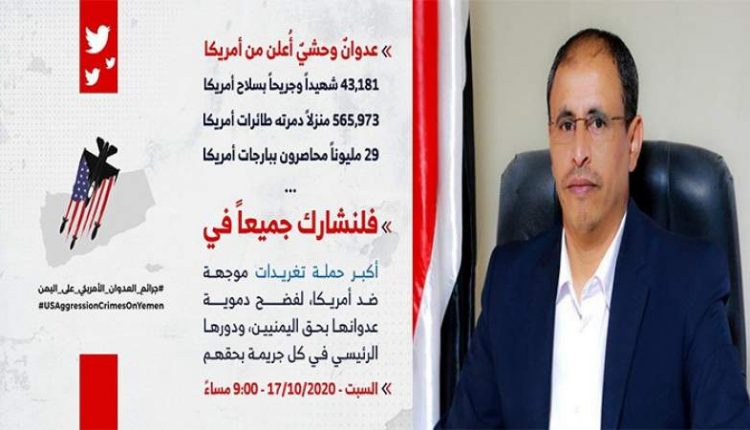 دعا وزير الإعلام ضيف الله الشامي للمشاركة الواسعة حملة التغريدات الكبرى التي ستنطلق الساعة التاسعة من مساء اليوم السبت، حول جرائم العدوان الأمريكي على اليمن على موقع التواصل الاجتماعي “تويتر”.