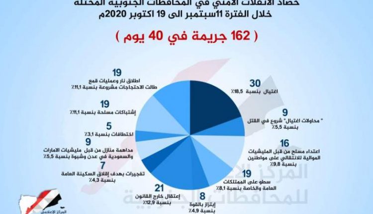 ورصدت الإحصائية التي حصل موقع “المسيرة نت” على نسخة 162 جريمة طالت مواطنين يمنيين من الجنسين في المحافظات الجنوبية المحتلة خلال الفترة من 11 سبتمبر حتى مساء الاثنين 19 أكتوبر 2020.