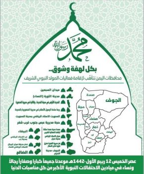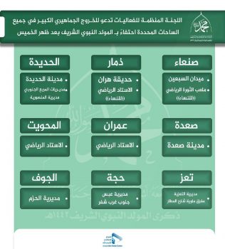 دعت اللجنة المنظمة للفعاليات جماهير الشعب اليمني العظيم للخروج الجماهيري الكبير في جميع الساحات المحددة احتفاء بالمولد النبوي الشريف  بعد ظهر الخميس في محافظات  صنعاء، صعدة، حجة، الحديدة، ذمار،  إب، تعز، عمران، المحويت، الجوف، البيضاء.