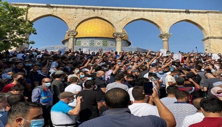 وانطلقت مسيرة نصرة للرسول عليه السلام من أمام المصلى القبلي بالمسجد المبارك، بمشاركة آلاف المصلين، وتوجهت إلى صحن قبة الصخرة وخرجت من باب الناظر.