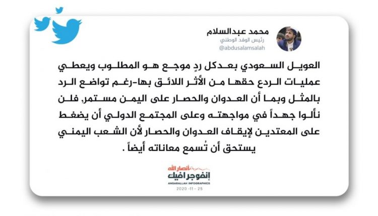 وأضاف عبدالسلام في تغريدة له ” بما أن العدوان والحصار على اليمن مستمرا فلن نألوا جهدا في مواجهته وعلى المجتمع الدولي أن يضغط على المعتدين لإيقاف العدوان والحصار لأن الشعب اليمني يستحق أن تُسمع معاناته أيضا.